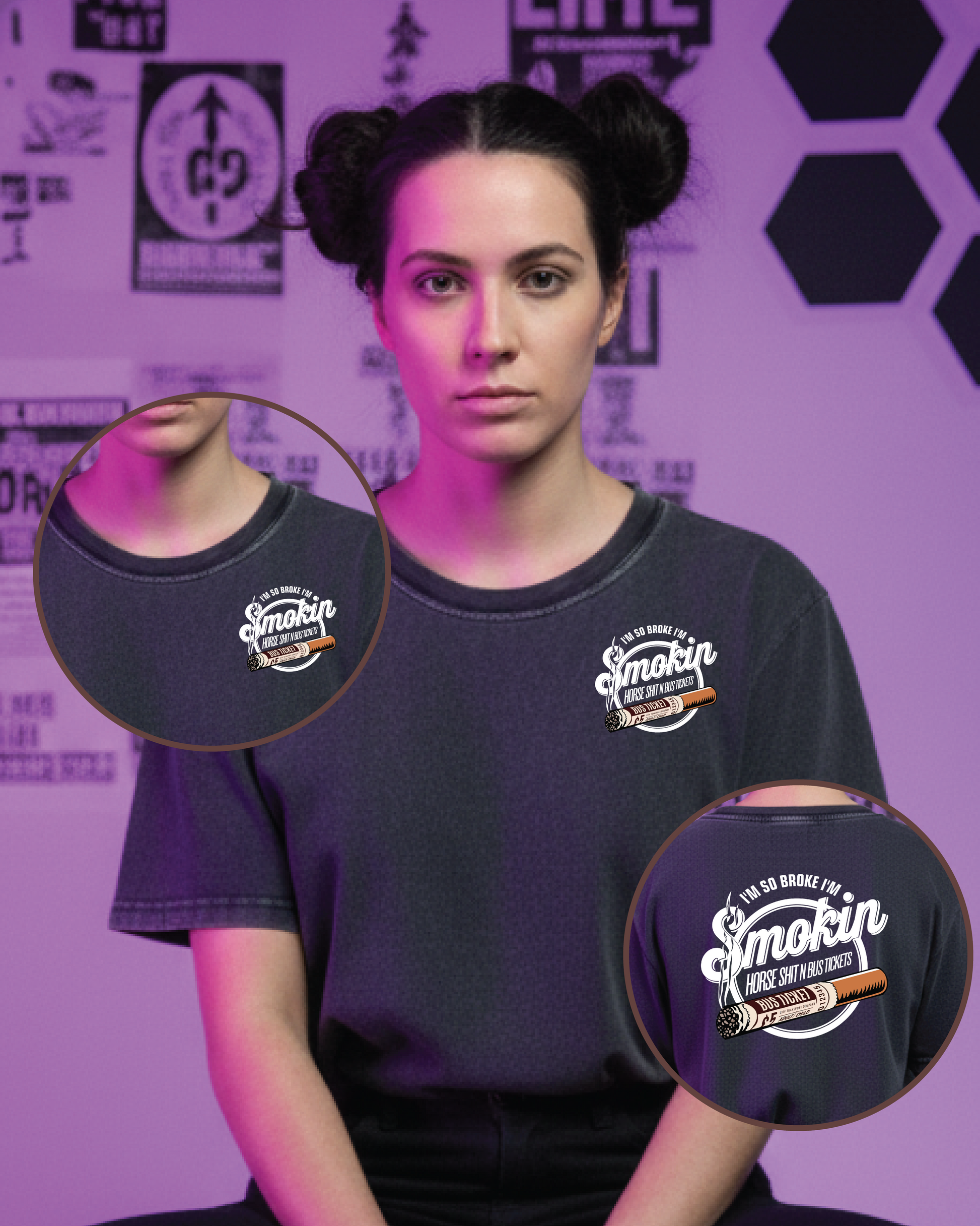 “I’m so broke I’m smokin horse shit n bus tickets.” — a statement piece that turns heads and sparks laughs.