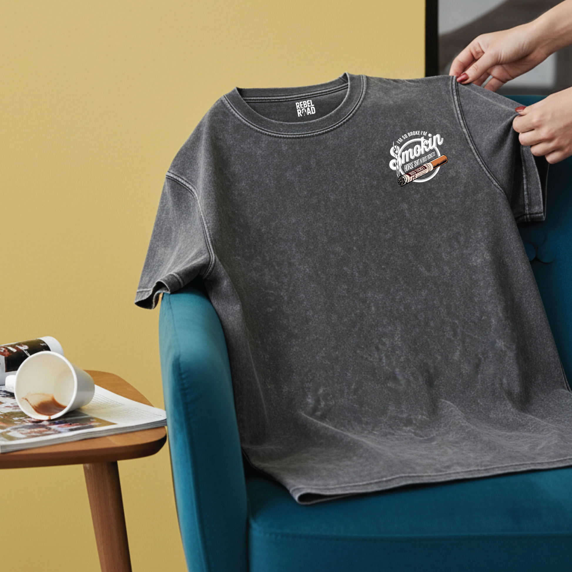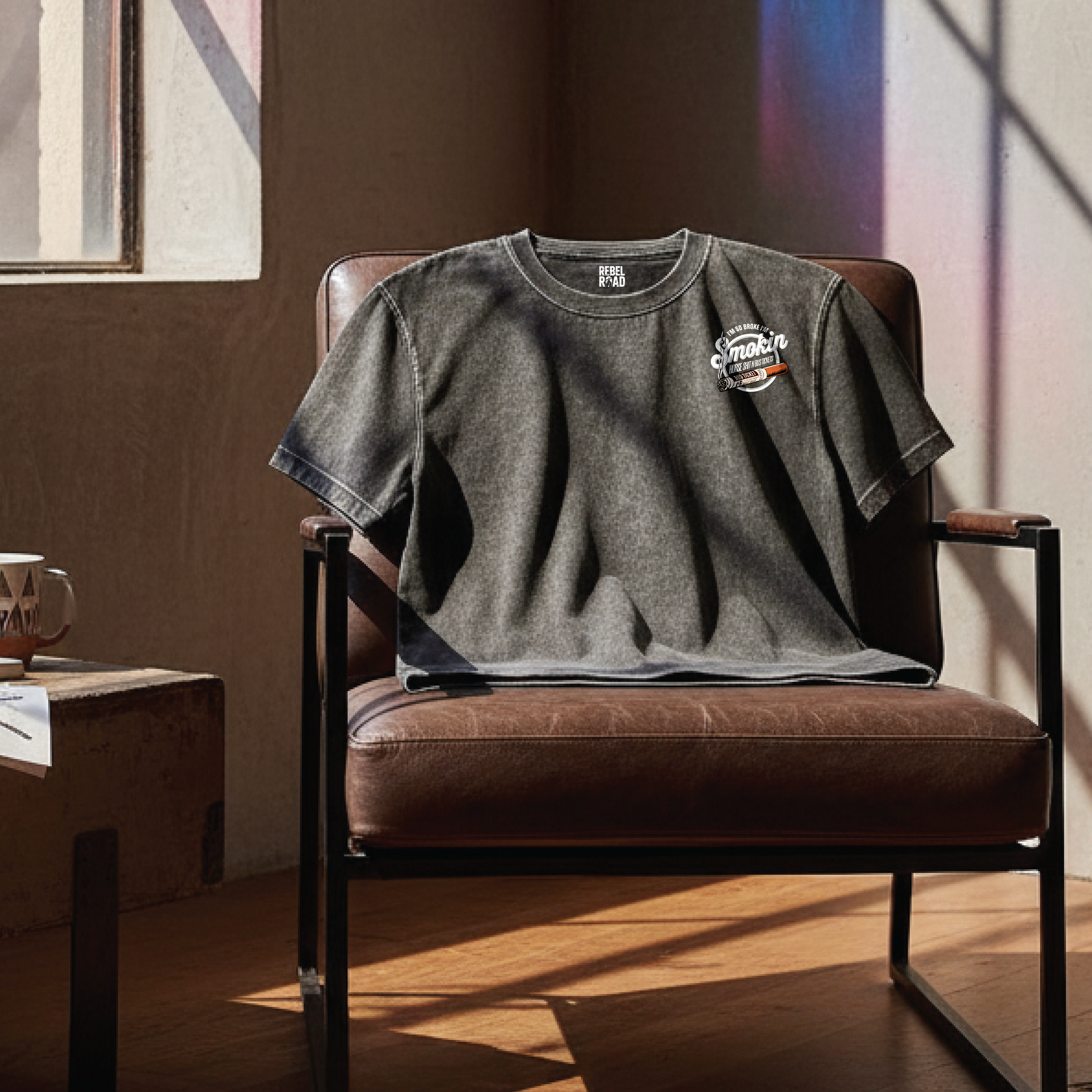 This one’s all about that worn-in look. The acid grey wash gives every tee its own character, while the oversized cut keeps it slouchy and relaxed. On the back you’ll find the bold Rebel Road graphic: “I’m so broke I’m smokin horse shit n bus tickets,” with a smaller chest print on the front.